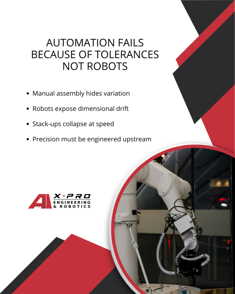 Automation is not primarily a robotics problem. It is a tolerance management problem engineered long before the first robot is commissioned.